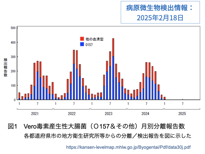 図1は、地方衛生研究所から報告されたVero毒素産生性大腸菌の月別分離報告数です。2024年も例年のように腸管出血性大腸菌が分離されています。