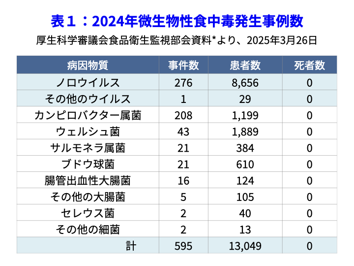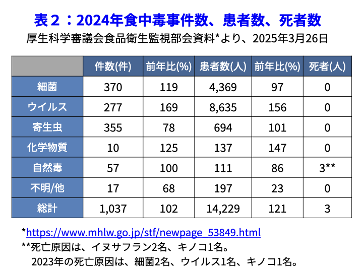 2024年の食中毒統計を分類し集計すると、表2のようになり、事件数はほぼ横ばいという印象を持たれるかもしれません。